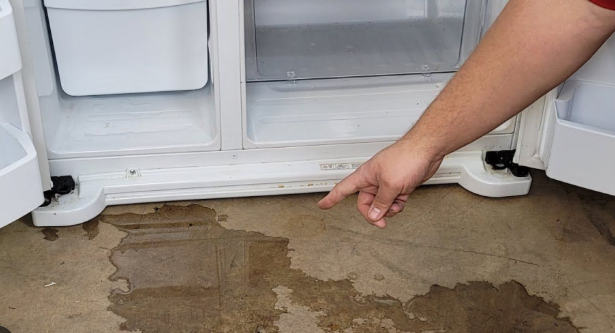 Water pooling inside or outside the fridge due to clogged drain or pipe issues.
